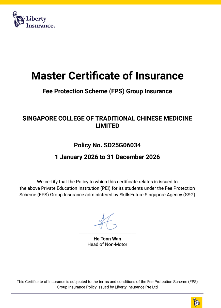 学费保障计划 (FPS) 的作用,是在发生私立教育机构破产及 / 或被监管机构责令关闭,无法继续营运的情况时,保护学生所缴付的学费。倘若新加坡法庭判决,私立机构必须缴交罚款、或将学费退还给学生,而该机构无法支付罚金或归还学费给学生时,学费保障计划 (FPS) 也将为学生提供保护。 所有持有EduTrust教育信托认证资格的私立教育机构都需在其学府实施“学费保障计划”以便充分保护其学生所支付的所有费用。 “所有费用”是指学生为了进入私立教育机构就读而支付的全部款项,但不包括课程申请费、代理佣金(如适用)、杂项费用(只在有需要的时候才须支付的非强制性、非标准费用)和消费税。 新加坡中医学院将承担 “学生学费保障”的投保费用。 新加坡中医学院已委任: Liberty Insurance Pte Ltd作为学费保障保险的供应方。 采用购买集体学费保险的方式为学生学费提供保障。 更多信息请点击这里查看