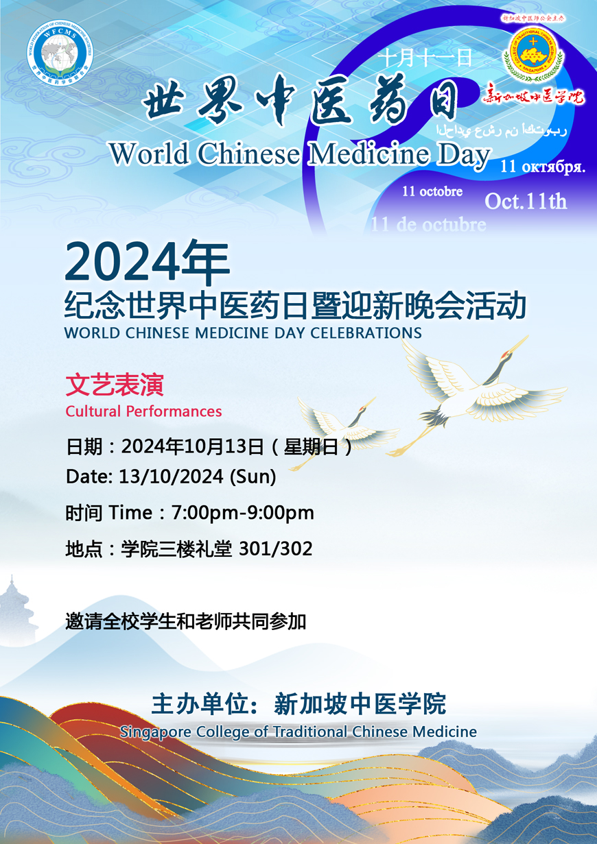 为欢庆2024年世界中医药日,我院于10月13日晚举办了庆祝“世界中医药日暨迎新晚会”文艺演出,学院董事、教职员和学生150余人参加。新加坡中医学院董事会吴佳盛博士在活动中致辞,他指出世界中医药日的意义在于进一步凝聚中医药界的智慧和力量传承发展中医药,推动中医药走向世界,发挥中医药在服务全球民众健康中的作用,并勉励新生刻苦努力,传承并弘扬好岐黄大业,为中医药事业发展做贡献。